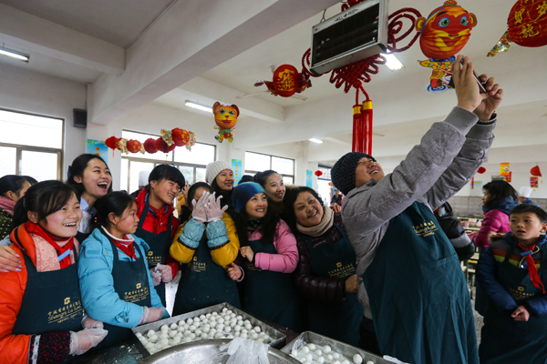 中國寧波網“i拍”記者竺仕寶:今早,四明山鎮小學來了一群愛心義工,他們千里迢迢驅車趕到老區。來自香格里拉大酒店的義工們帶來了制作湯圓的材料糯米粉、白糖、芝麻與山里的孩子們一起搓湯圓吃湯圓,提前感受濃濃的年味。