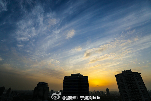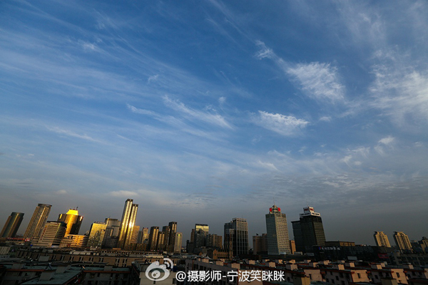 傍晚日落時分,寧波高空明麗的蔚藍色,流動的云朵在空中隨風翩翩起舞,時而金黃,時而潔白,時而象火一樣紅,很少看見這么美的天空。