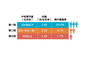居民階梯氣價制度以戶為單位(對應的家庭戶籍人口為4人),以年度為計量周期,確定三檔氣量和對應的價格,各檔價格按用氣量實行超額累進加價。第一檔、第二檔、第三檔年用氣量分別為324立方米及以下、324立方米至504立方米(含)、504立方米以上,對應的價格分別為每立方米2.95元、3.5元和4.5元。按2014年寧波市區居民用戶實際用氣量數據測算,各檔氣量用戶覆蓋率分別達到93.6%、4.7%及1.7%。階梯氣價方案按照“保基本、促節約”的原則確定。各檔氣價比價關系基本保持在國家發展改革委指導意見要求的1:1.2:1.5水平。