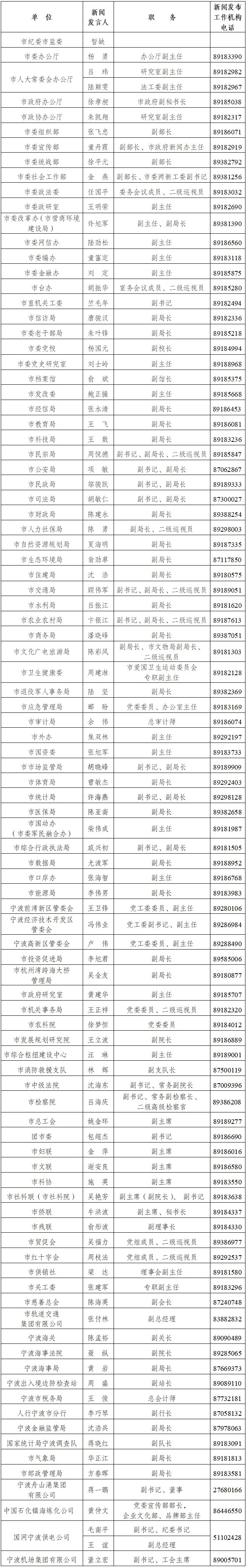 寧波市各有關部門新聞發言人名單及新聞發布工作機構電話