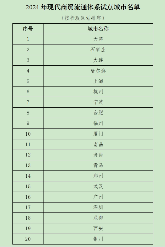 圖為2024年現(xiàn)代商貿(mào)流通體系試點城市名單。來源:商務(wù)部網(wǎng)站截圖
