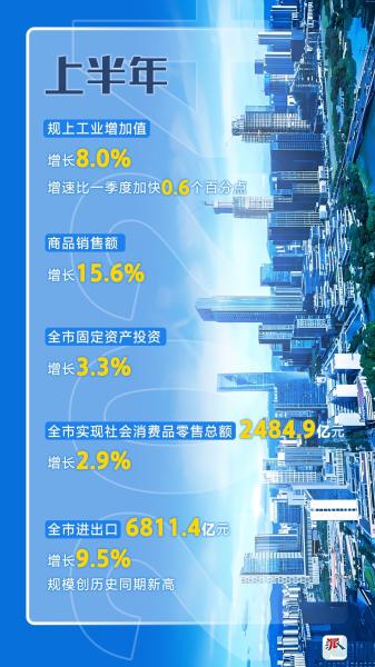 上半年,全市規模以上工業增加值同比增長8.0%,比一季度加快0.6個百分點。